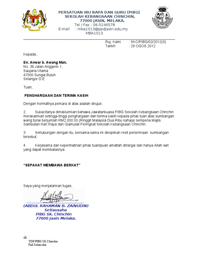 Contoh Surat Terima Kasih Atas Sumbangan Wang Contoh Surat